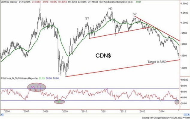 The decline of the loonie got underway in May 2013. The loonie broke down from what appears as a possible large head and shoulders top pattern. The decline initially was slow but picked up pace in the latter part of 2013 falling from around 0.97 to under 0.90 by March 2014. At that point, a strong rebound got underway and by July 2014 had recovered to around 0.94. With collapsing oil prices, the loonie started a steep decline currently falling to around 0.8350. Since hitting a high near 1.06 in July 2011 the loonie has lost roughly 21% against the US$. But is it now approaching a potential bottom? The potential objective from the head and shoulders top pattern was 0.8350. The loonie is there.