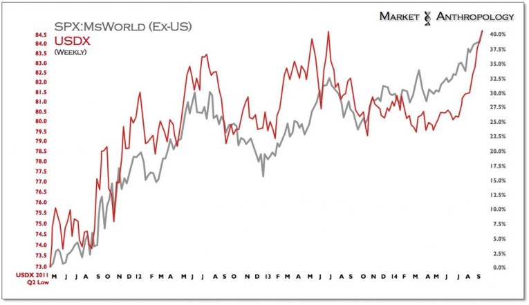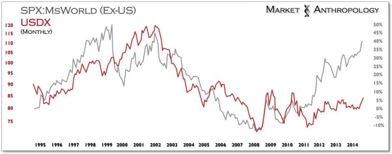 In today's policy driven system, where fundamentals have been melded and supplanted by the hand of the Fed, the relative outperformance by our own monetary authorities has not only buttressed US equity markets relative to the world, but also the dollar. This dynamic has been in place since the embers of the US financial crisis, blew across the pond in the summer of 2008 and ignited a firestorm around the world that fall. Despite our clear culpability in setting the world ablaze, in another counterintuitive twist of fate, we had a head start of working and digging the fire lines, that eventually brought the economic disaster under control - first. The "new normal", posited directly following the financial crisis, looked a whole lot like the old normal from the late 1990's.