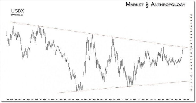 With the US dollar index now flirting with the topside of its long-term range, a break above might imply that the move was not the last third - but a new game altogether. Considering the juxtaposition of the Fed withdrawing its fire brigade as the rest of the world turns up their hoses - how likely does that seem?