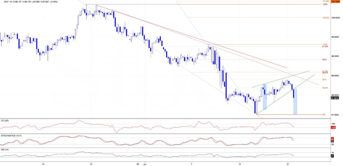Sell signals on H4 remain active. Therefore, as long as DX.F stays below the broken wedge line (no clean invalidation), downside pressure stays dominant. In other words, a second leg lower is on the table unless bulls return fast and decisively and defend the 97.90-98.00 floor.