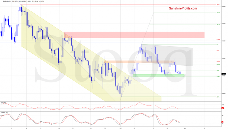 Although EUR/USD moved down a bit earlier today, the green support zone coupled with the 61.8 % Fibonacci Retracement continues to hold declines in check. Let’s recall our yesterday’s comments as they’re also valid today: