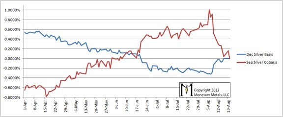 Instead we see that against the mechanics of the roll, the cobasis has collapsed. Also, another interesting observation is that the December basis, which has been negative since June 20, has now risen to zero. December silver is on the verge of being in contango.