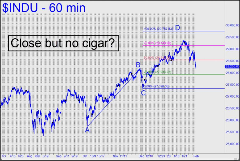 From a technical standpoint, it is troubling that the Dow's seemingly invincible rally sputtered out without having reached the 29,757 target shown in the chart. This is close enough to the milestone number 30,000 that it should be considered magnetic. A case of 'close but no cigar'? Wall Street would be forever shamed if the greatest bull market of them all were to die just inches from so obvious and compelling a target. It will remain viable nonetheless unless the pattern's point 'C' low, 27,326, is exceeded to the downside. I should also mention that, under the rules of our trading system, the Dow would trigger a 'mechanical' buy at 27,934, stop 27,326. This would be a scary place to jump in, but that's what the 'mechanical' set-up -- one of five that we use to get long or short -- was designed to handle. We won't presume to know how things will turn out this week, but our inclination would be to sell into strength as long as the virus story appears to be waxing.