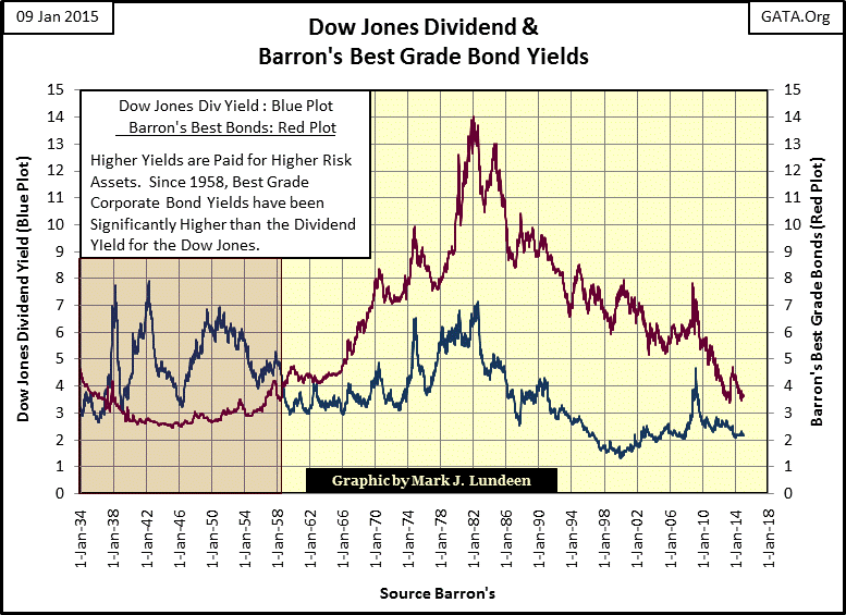 Next is Barron’s Stock/Bond Yield Gap, published for decades in their Weekly Bond Statistics using a ratio of the above two yields. It’s pretty obvious that since 1958 when the Dow Jones’ dividend yield fell below the yield for Best Grade Bonds, investment decisions to purchase blue-chip stocks were driven more by the desire to capture inflationary-capital gains than for dividend income.