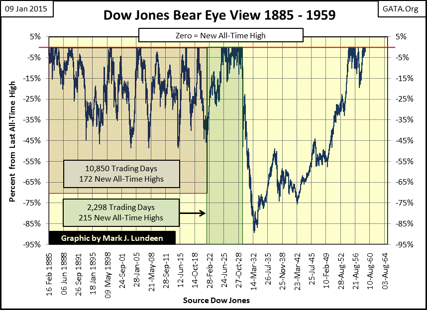 Here’s the Bear’s Eye View (BEV) of the Dow Jones data from the chart above. What’s a BEV chart? It’s a technique to remove decades of inflation from a long term data series. Each data point is expressed as a percentage with new all-time highs expressed as Zero%. Daily closes not making new all-time highs are expressed as a percentage decline from the last all-time high. I like to think of a BEV plot as the view Mr Bear has of the market. Mr Bear doesn’t care about new all-time highs; they’re all big fat Zeros to him, he’s only concerned about how many percentage points he can claw back from the bulls. As seen below, the BEV plot beautifully illustrates the changes in the stock market made manifest by the Federal Reserve. After the inflationary 1920s (when for the first time in history daily new all-time highs became routine), came the deflationary 1930’s. After the Great Depression, the Dow Jones would not see another new all-time high until 23 November 1954.