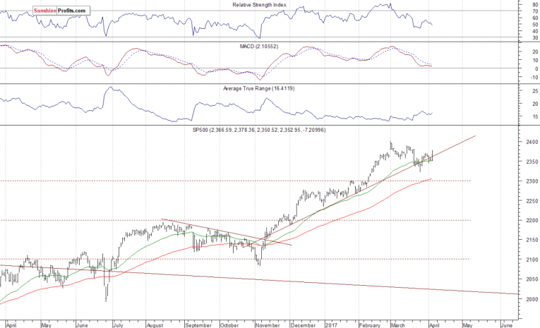 The U.S. stock market indexes lost 0.2-0.6% on Wednesday, following relatively big move up, as investors reacted to the FOMC Minutes announcement. The S&P 500 index extended its short-term uptrend, before going closer to its recent local lows and support level of 2,350. The index remains around 2% below March 1 all-time high of 2,400.98. The Dow Jones Industrial Average closed below 20,700 mark, and technology Nasdaq Composite index reached new all-time high above the level of 5,900, before closing 0.6% lower. Is this a new uptrend or just upward correction within new medium-term downtrend? The nearest important level of support of the S&P 500 index is at around 2,350, marked by the above-mentioned recent local lows. The next support level is at 2,335-2,340, marked by local lows. The support level is also at 2,320, marked by February 13 daily gap up of 2,319.23-2,321.42 and last week's Monday's local low. On the other hand, the nearest important level of resistance is now at 2,370, marked by short-term local highs. The next resistance level is at 2,380-2,400, marked by all-time high, among others. We can see some short-term volatility following five-month-long rally off last year's November low at around 2,100. Is this a topping pattern before downward reversal? The uptrend accelerated on March 1 and it looked like a blow-off top pattern accompanied by some buying frenzy. The S&P 500 index continues to trade along its medium-term upward trend line, as we can see on the daily chart:
