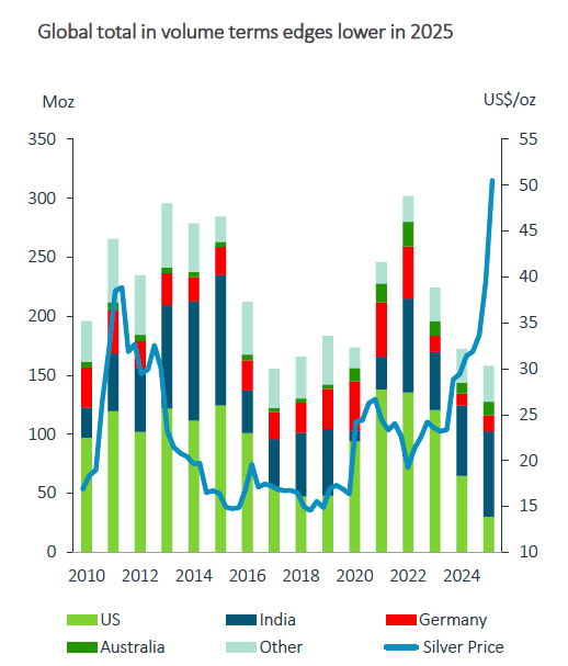 "These developments coincide with elevated macroeconomic and geopolitical risks, including US trade policy, prompting investors to lift allocations to precious metals for portfolio diversification. As a result, investment demand has strengthened noticeably, comfortably offsetting the weakness across all key areas of silver demand."