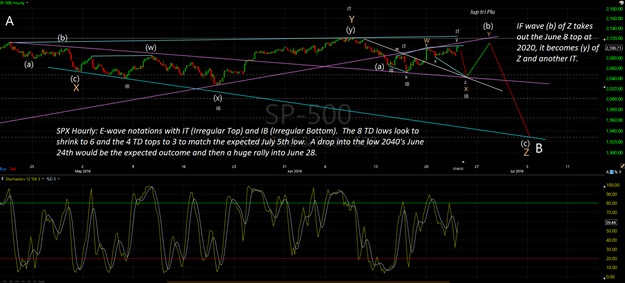 The masses of Irregular Tops (IT) and Bottoms (IB) since the April top should not have surprised me, as they seem to be ongoing. Today’s IT is one example -- and it is one step higher degree in amplitude than the last mid 8 TD cycle top (TD 5) last Wednesday, suggesting a higher amplitude degree of moves going forward. Now we seem to be running 3 and 6 TD cycles instead of the usual 4 and 8 TD cycles.