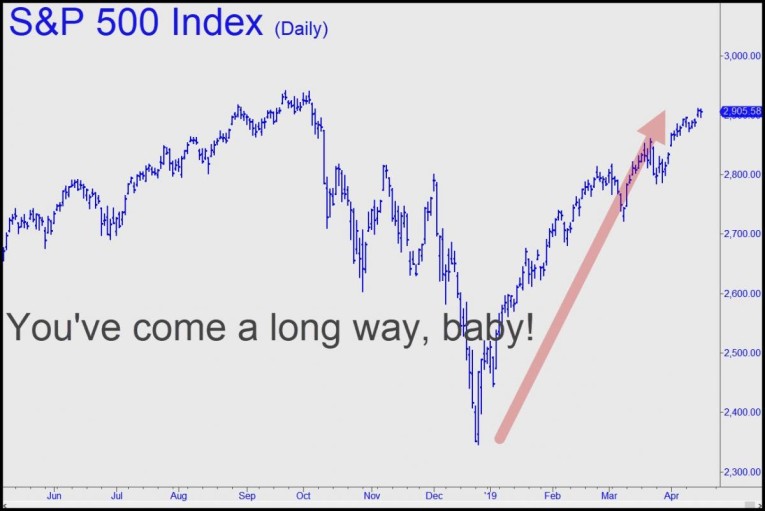 When the S&Ps took a bold leap on December 26 after plummeting 500 points earlier in the month, few could have imagined what would happen next. It were as though, missing an arm and a leg, a soldier had vaulted from a trench in the heat of the Battle of the Somme and shouted “Vive la France!” In the movie, the soldier is dead before he stumbles and hits the ground. But on Wall Street, U.S. stocks were just beginning their most powerful rally ever. The S&P 500 Index has risen 600 points and is closing fast on the record 2941 recorded in September.