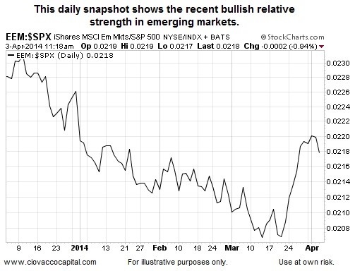Driven partly by hopes Chinese officials will implement some additional and fairly significant reflation projects, emerging markets stocks (EEM) have performed well recently relative to the S&P 500 (SPY). From The New York Times: