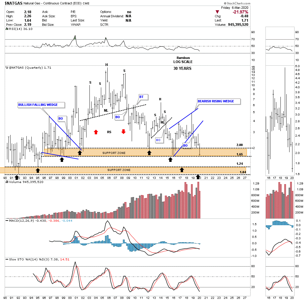 This 30 year monthly chart for $NATGAS shows it has been in a bear market since July of 2008 when it completed the head of its massive H&S top. Currently the price action is sitting on the massive support and resistance line that goes all the way back to September of 1995 as shown by the black arrows.