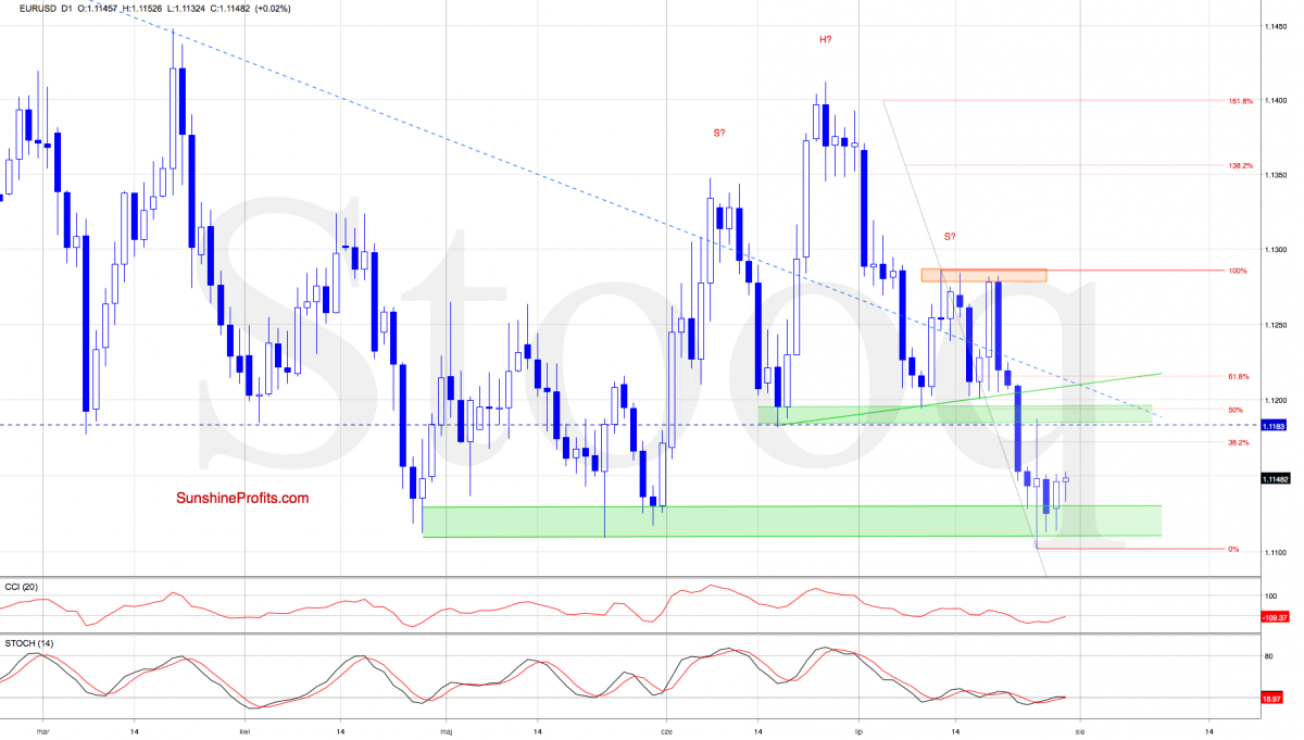 EUR/USD hasn’t moved much yesterday or earlier today – it’s meandering around last week’s lows and the green support zone.