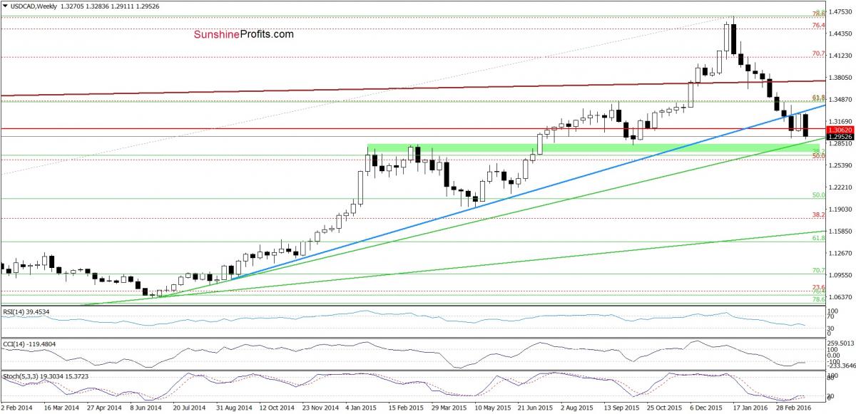 From today's point of view, we see that USD/CAD verified earlier breakdown under the medium-term blue line (as we had expected), which encouraged currency bears to act and resulted in a sharp decline. Thanks to this move, the exchange rate dropped under the lower border of the blue declining trend channel (marked on the daily chart) and reached the March low yesterday. What's next? Taking into account the medium-term picture and sell signals generated by the daily indicators, we think that further deterioration is just around the corner and USD/CAD will test the Oct low and the green support zone (which is also reinforced by the medium-term green support line) in near future.