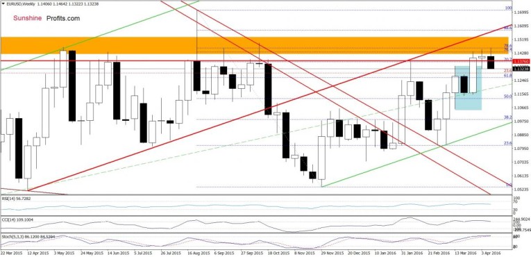 (...) although EUR/USD moved little higher, the pair remains under the key orange resistance zone. Therefore, in our opinion, as long as there won't be a breakout above it and the red rising resistance line (based on the Apr and Jul 2015 lows), further improvement is not likely to be seen.