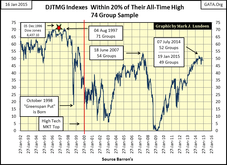 But investors have the same problem with both the S&P 500 and Dow Jones since both attempt to express general market conditions using a specific number calculated and published at the end of the day. The data for the DJTMG slices the stock market (and the economy) into many different groups. Here’s my table for the DJTMG 52Wk Highs and Lows from Barron’s 19 January 2015 issue. We see at the end of this week that 58 of 76 total groups are currently within 10% of their 52Wk Highs, with six groups actually at new 52Wk highs for the week and six making 52Wk Lows.