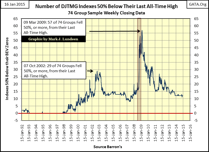 Here’s a chart for what I call the Bottom 50%, or the number of DJTMG indexes declining 50% or more from their last all-time high. Looking at the 09 March 2009 row above, you may wonder where all the groups were; far below the table’s -30% column! Fifty-seven groups had declined 50% or more, and an incredible twenty-four groups were 70% or more below their last all-time high in Barron’s 09 March 2009 issue.