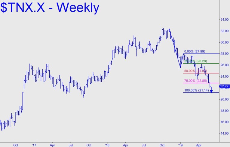The stock market’s reaction was feeble, but only because DaBoyz are already pacing themselves to milk every inch of upside they can from the central bank’s new spin. Perhaps this is what will push the S&P 500 index to 3095, a Hidden Pivot target of mine that has seemed a little farfetched. I still have my doubts it will be reached, but I’ll stick with it unless my technical runes take a turn for the worse. In the weeks and months ahead, we’ll surely be hearing plenty about how easing will re-invigorate the housing market. I am predicting otherwise, since this particular gas bag has already begun to deflate. But who knows? Perhaps Southern Californians who live in dumpy little, million-dollar Eichlers will upgrade? My forecast calls for 10-Year rates to decline to at least 2.11%from a current 2.22%. That may not be enough to launch stocks into the sort of parabola they achieved in Q1, but it’ll probably hold stocks buoyant for a while.