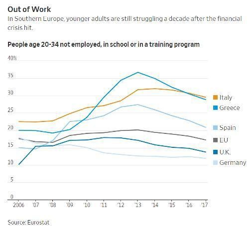 Add it all up and you get fertile ground for politicians willing to promise a quick fix. In Italy, the populist 5 Star Movement and League parties won a combined majority of the youth vote and now run the show. In Spain, 40% of voters under 35 are, according to polls, leaning towards the far-left party Podemos and its political allies. In Greece, more than 41% of those age 18 to 24 voted for far-left Syriza in the 2015 election.
