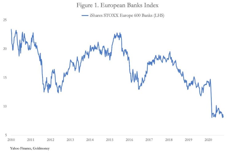 The STOXX Europe 600 banks includes Eurozone, British and other European banks. Over this calendar year, the index has fallen by 43% at a time when equities recovered strongly following the FOMC’s announcement of unlimited QE on 23 March 2020.