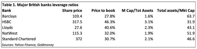 As the second most important international finance centre, London was bound to follow suit. In addition to the Eurozone exposure, and with the financial conflict between America and China escalating over Hong Kong, London faces risks from HSBC and Standard Chartered, two major British banks most of whose business is centred in Hong Kong and the Far East. And at over £2.6 trillion, these two banks have combined balance sheet liabilities that exceed Britain’s contracting 2020 GDP by nearly 40%. The full horror of the position of Britain’s banks is illustrated in Table 1 below.