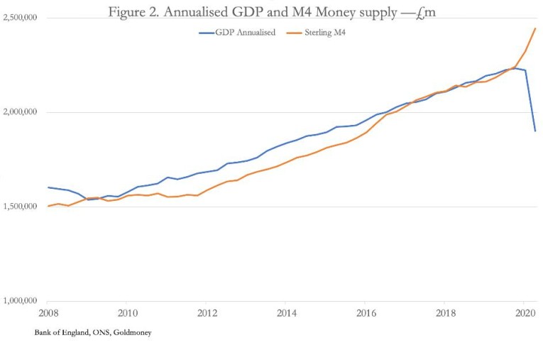 At this juncture, it is important to understand something to which macroeconomists are generally blind: GDP is the sum total of all transactions, which without the addition of extra money is a static figure. Economic progress, or the lack of it, which is what GDP purports to measure cannot be measured, and an increase in GDP is simply an increase in the quantity of money in the economy. This is confirmed in Figure 1, where the quantity of UK broad money supply (M4) closely tracks annualised GDP, that is until this year, when the coronavirus hit — more about this divergence follows later in this article.