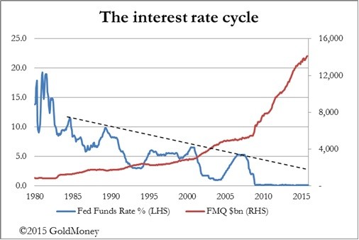 The chart below illustrates the problem. It is of the Fed Funds Rate since 1980 and the Fiat Money Quantity, which simply put is the sum of the commercial banks’ reserves at the Fed, plus cash and sight deposits held at the banks.