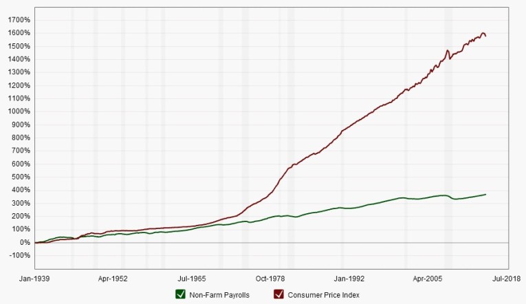 Since 1971, when Richard Nixon removed all restraint on money supply by closing the Gold Window, the US Economy, as demonstrated by the level of Non-Farm Payrolls, has NOT followed the path of the CPI. Since 2000, as the US has moved more and more away from a Free Market Economy, the Economy and Employment have stagnated.