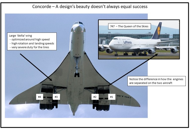 Rather than going into an exhaustive description of the Concorde's design and the details of the investigation, the two lists below provides sufficient understanding of the decisions and compromises that drove the plane's design and made it prone to the type of accident she suffered in July 2000.