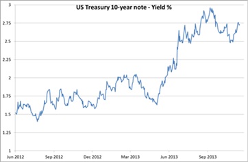 Since 30th October the Treasury 10-year note yield has increased from 2.5% to 2.75%. During that time it has been more widely acknowledged that tapering has been deferred for the foreseeable future. This being the case, the rise in yield indicates that underlying tightness in bond markets has returned after a brief pause, despite the Fed's bond purchases and the liquidity this provides. Therefore, QE3 may need to be supplemented by other measures if interest rates and bond yields are to be maintained at current levels.