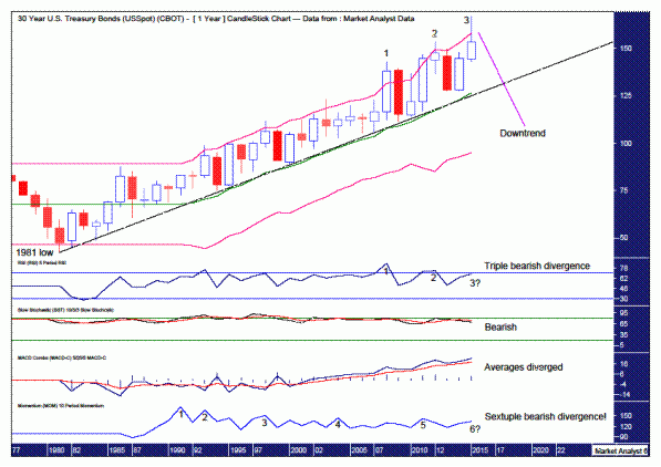 The fact that there are so many bearish indications on this big picture yearly chart spells massive trouble. Let’s be clear about this. The coming drop in bond prices will send shockwaves throughout the world.