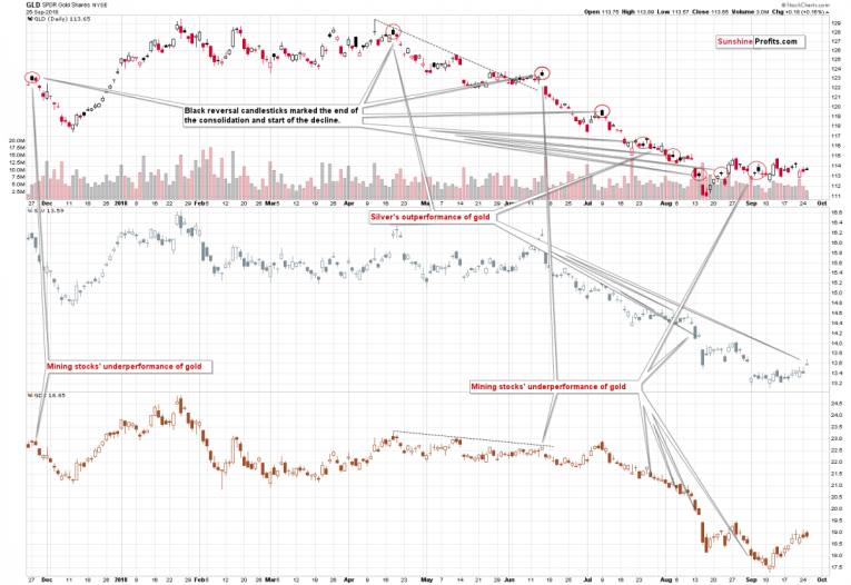 The above chart shows how often silver outperformed gold right before declines and it shows a few additional things as well. One of those things is mining stock’ underperformance and the other is the shape of the sessions of the GLD ETF.