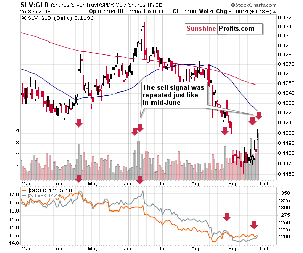 Looking at the SLV to GLD ratio chart provides us with clearly bearish confirmations, not only because of the quick run-up in the value of the ratio, but also because of the volume spikes.