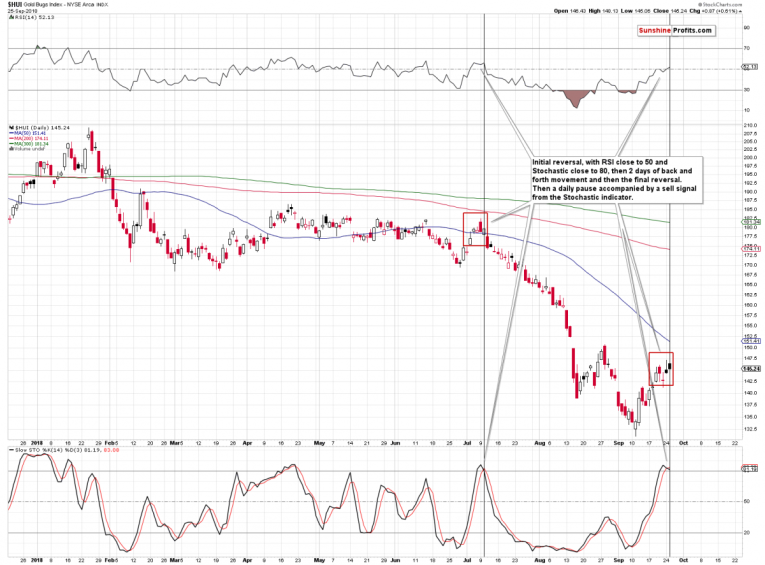 There was an initial reversal, then 2 days of back and forth trading and then the final reversal. It was all accompanied by the RSI close to 50 and the final top was confirmed by a sell signal from the Stochastic indicator. Then there was a day when the HUI moved back and forth, but ended the session relatively unchanged. And we have the same thing today as well. Back in July, that was the final session before the big decline started, so the implications of this similarity are bearish.