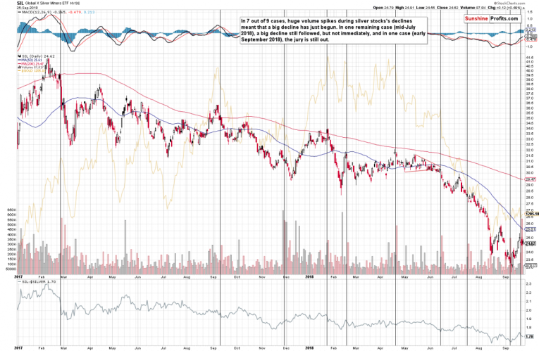 The silver stocks have not only declined this week, but they have done so on huge volume. We marked similar cases with vertical lines. In almost all cases since the beginning of 2017, when we saw declines on huge volume in the SIL ETF, it meant that a big decline is about to begin or that it’s already underway. The signal was reliable not only for silver stocks, but also for the rest of the precious metals sector. You can see how gold performed – its price is in the background of the chart.