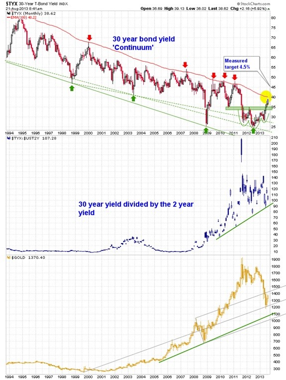 The relationship between long term bonds (30) and short term bonds (2) in the middle panel is currently negatively diverging gold as the ratio has dropped this month. Again, we wonder is gold (bottom panel) leading the curve this month or should gold bugs take caution? I think gold is leading the curve, but it bears watching. The relationship became distorted in second half, 2012.