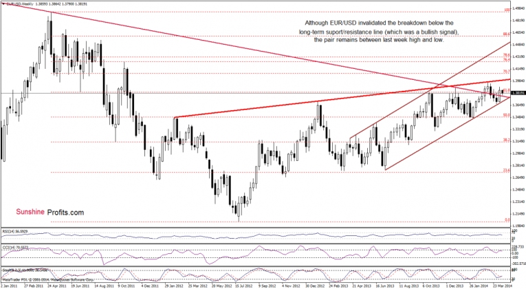 From the weekly perspective, we see that GBP/USD climbed higher and hit a fresh 2014 high. Despite this bullish sign, the exchange rate still remains below the strong resistance zone created by Aug. and Nov. 2009 highs, which may pause or even stop further improvement.