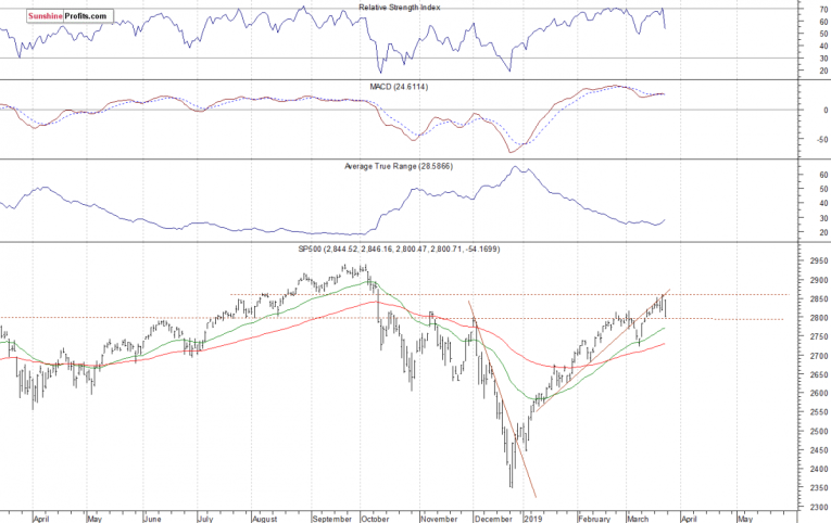 Expectations before the opening of today's trading session are negative, because the index futures contracts trade 0.2-0.6% below their Friday's closing prices. The European stock market indexes have lost 0.2-0.3% so far. There will be no new important economic data announcements today. The broad stock market will likely fluctuate following the Friday's sell-off. However, if the index breaks below the 2,800 mark, we could see more selling pressure.