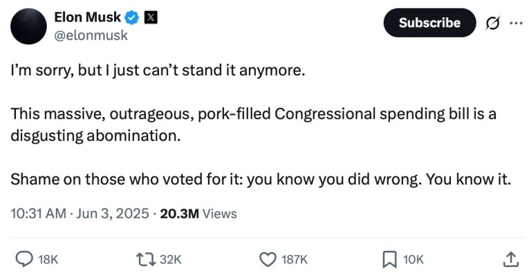 Musk added in a follow-up post that the bill “will massively increase the already gigantic budget deficit to $2.5 trillion (!!!) and burden America citizens with crushingly unsustainable debt.”