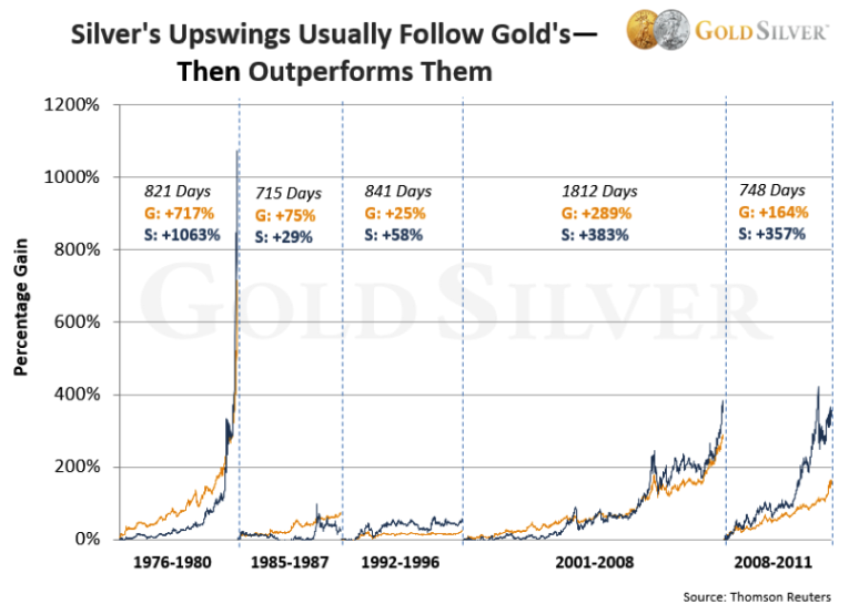 In three of gold’s five biggest bull markets, silver clearly trailed the gold price in the beginning stages. It caught up and eventually surpassed gold’s total return, but it usually got off to a slower start than gold. Sound familiar?