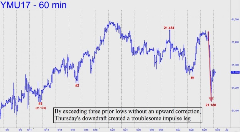 Elsewhere on the Rick’s Picks home page, I’ve offered a mildly bullish short-term projection for the E-Mini S&Ps. However, I proffer the Mini-Dow’s chart (see inset) as a cautionary note, since Thursday’s downdraft did impressive damage to the hourly chart. Specifically, it exceeded three prior lows, two of them ‘external’, without an upward correction. We’ll get a better sense of how serious this is if and when the futures roll over and take a second leg down. If it should reach or exceed the down-trending abc pattern’s ‘d’ target, that would have bearish implications at least for the near term.