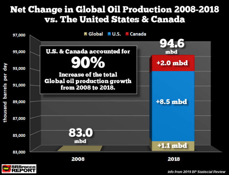 As total world oil production increased by 11.6 million barrels per day (mbd) since 2008, the United States accounted for 8.5 mbd, Canada 2.0 mbd, and the rest of the world 1.1 mbd. If we look at the net increase of global oil production versus the U.S. and Canada during the same period, this is the result: