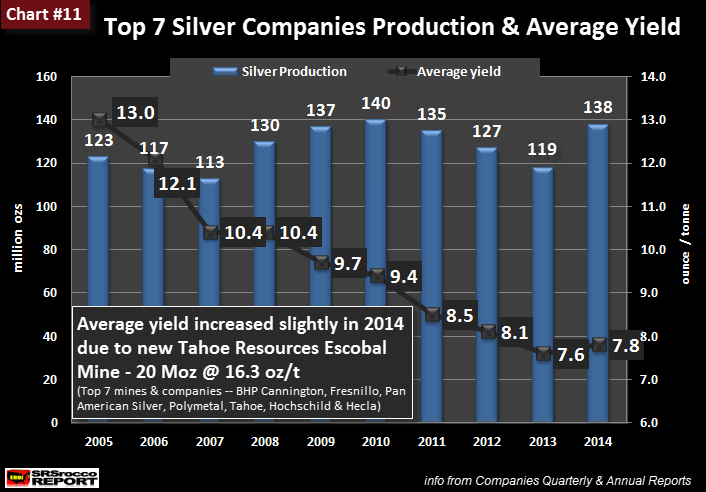 Tahoe’s Escobal Silver Mine’s average yield in 2014 was an astonishing 16.3 ounce per ton (oz/t).  Not only did Escobal Mine enjoy one the highest silver yields in the world, it produced over 20 million oz (Moz) in 2014.  Thus, the addition of Tahoe to the Top Silver Miners pushed their average yield to 7.8 oz/t in 2014 versus 7.6 oz/t in 2013: