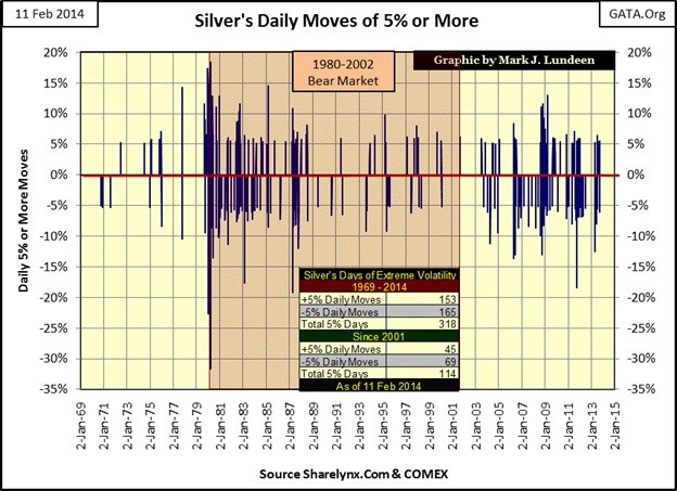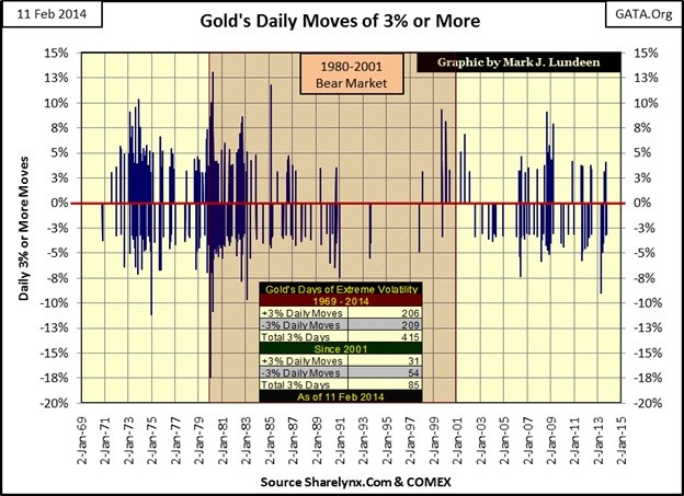 We can see how daily volatility for the 1969-1980 bull market and for the first three years of the 1980-2001 bear market was much greater than it has been so far for the 2001-2014 gold bull market. This is yet another of the many finger prints left behind by the manipulators of the gold market. When the “policy makers” lose control over the price of gold, we should expect some historic moves in the price of gold. Currently, the largest positive daily move occurred on 19 March 1980 with a 13.05% move, but this gain occurred two months after the top in the gold market. When this record daily percentage gain is finally exceeded, I expect it will prove to be a bull market event.
