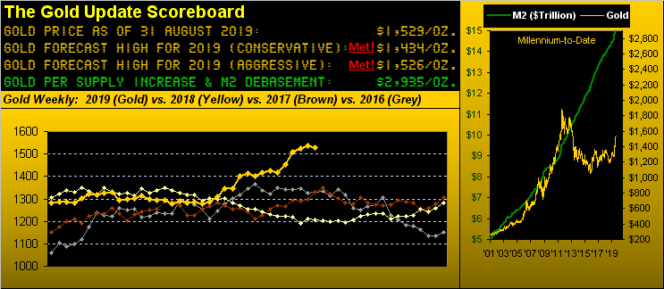 Two-thirds of 2019 is in the books with Gold lookin' great and Silver a-sizzlin'. Dips en route notwithstanding, the fervour is such that you wouldn't wanna bet there's no upside left. To be sure, the precious metals have come a comparatively long way up this year, as is their wont when (as we're finally seeing) they get noticed. But 'tis not too late to participate! For as Mark Twain succinctly stated: "The secret of getting ahead is getting started." Which in the Big Picture is only what the precious metals are just now doing. So don't miss this train!