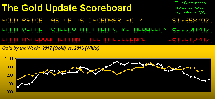 So with just two trading weeks left in 2017, much of this year's theme has been about Gold's reprising 2016. One thus wonders if this yet again is December's annual dip leading to a January Gold grip. A week ago we described Gold's having put in six down Decembers of the past seven ... but that five of the past six Januaries have been up. Is this just getting too easy to trade? Save for the stock market which obviously never goes down, you know the old saying: "If 'tis obvious what a market is going to do, it generally doesn't." Let's see where the precious metals are in two weeks' time toward then making an directional assessment for January.