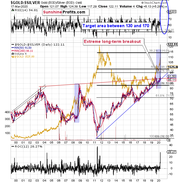 The breakout is a game-changer. It means that we are in uncharted waters and that it’s a tough call to say how high can the gold to silver ratio really rally, since it was just strong enough to pierce through a multi-decade resistance like a hot knife through butter.
