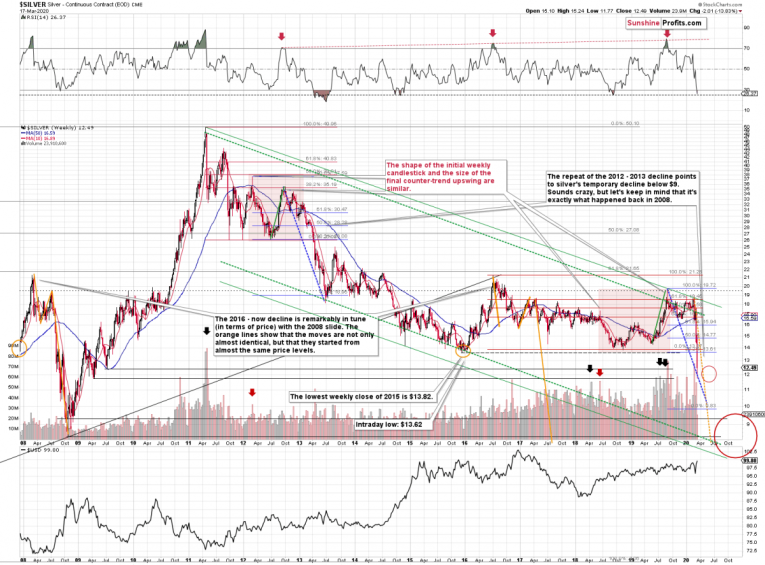 The analogy to 2008 has been working remarkably well in terms of prices. That’s what the yellow lines represent. The most recent slide in silver is almost perfectly in tune with the initial sharp slide that we saw in 2008. Once you click on the chart to zoom in, you’ll see a thin black line that shows the size of the slide in 2008, and you’ll see that we copied it on the left side of the current decline. They are so similar that it’s shocking even for us – and we’ve been writing about this extreme similarity for many months.