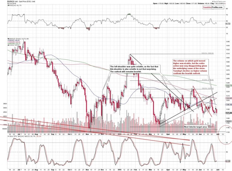 Gold moved higher yesterday and… That’s about it when it comes to listing yesterday’s bullish signs. The size of the move compared with its likely cause (closed banks in Greece and the introduction of capital controls), however, is actually bearish. Gold didn’t react in a meaningful way to a very bullish factor, and this is a strong sign that the gold market lacks buying power and that it will move lower sooner rather than later.