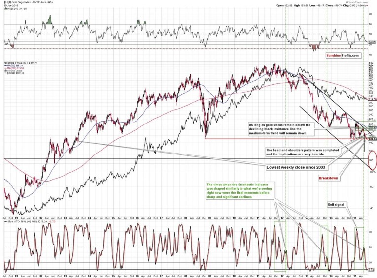 Gold and silver declined yesterday, but the really profound action was seen in the precious metals mining stocks. Both key indices for this sector (the HUI and XAU) declined below their respective 2008 lows and managed to close below them. What’s next? Will gold and silver stocks bounce like they did in late 2014?