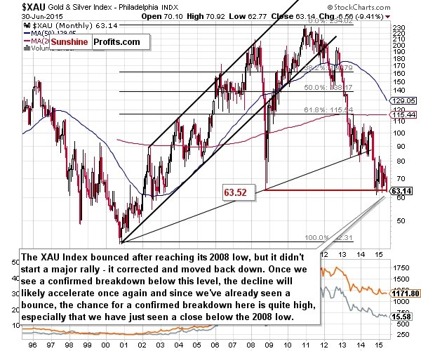 We see exactly the same signal on the above chart. The XAU index closed below its 2008 low, but before this has very meaningful implications we will need to see the confirmation of the breakdown.